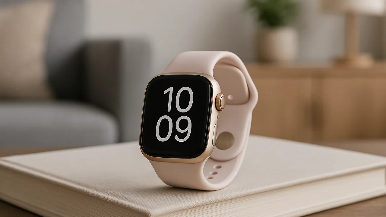 Versão topo de linha com tela maior, sensores avançados de saúde e recursos como ECG, SOS e Apple Fitness+. A pulseira blush-clara é confortável e combina com o visual moderno.